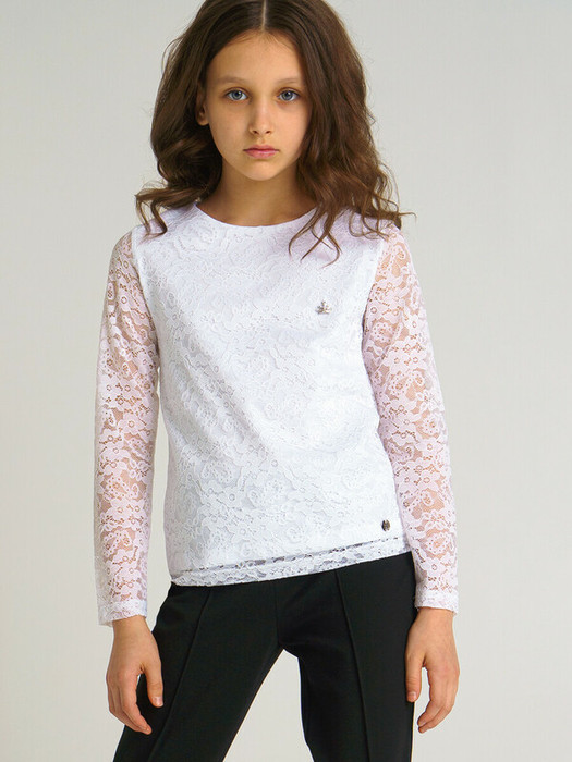 Белый трикотажный джемпер прямого силуэта для девочки подростка - прекрасная альтернатива текстильной блузке или рубашке. Школьная кофта очень мягкая и приятная на ощупь,  хорошо держит форму, комфортна в носке и проста уходе. Высокое содержание хлопка 95%. Благодаря наличию эластана в составе ткани, изделие проще в уходе и держит форму. Джемпер в школу с длинным рукавом и декором из кружева разнообразит повседневные образы школьницы.