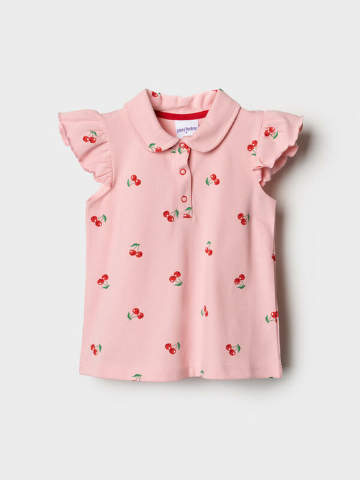 Детская футболка-поло для девочки. Модель прямого кроя, выполнена из эластичного хлопкового трикотажа пике. Яркий принт с вишнями. Отложной воротник с застежкой на кнопки. Рукава-крылышки.