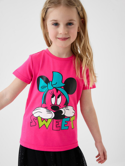 Детская футболка для девочки. Модель прямого кроя, выполнена из эластичного хлопкового трикотажа джерси. Спереди расположен крупный принт с Минни Маус. Горловина круглая.