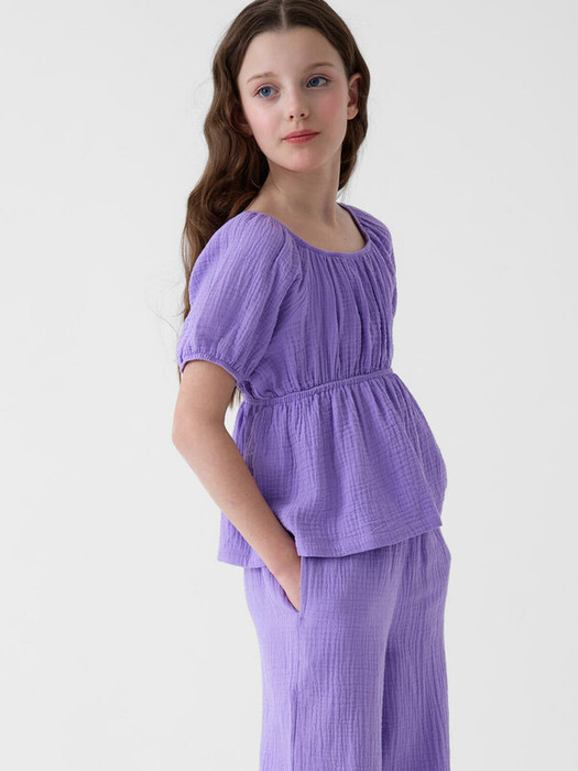 Легкий летний комплект для девочки подростка. Состоит из укороченной блузки и широких брюк. Материал – мягкий хлопковый муслин, дышащий и приятный к телу. Блузка с пышными короткими рукавами и сборкой на резинке по талии, что создает аккуратную и женственную форму. Брюки – длинные и свободные, с высокой посадкой и резинкой на поясе. По бокам — удобные карманы.