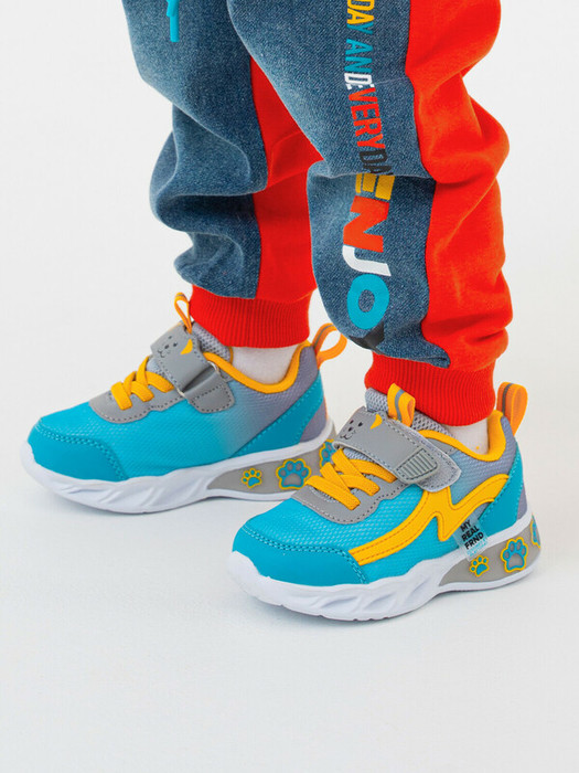 Кроссовки из комбинации искусственной кожи и воздухопроницаемой сетки; подошва со светящимися элементами; подкладка c высоким содержанием хлопка 80%; кожаная стелька с анатомическим элементом; удобная застежка-липучка; эластичные шнурки; формоустойчивый задник поддерживает стопу в правильном положении; облегченная подошва; удобная колодка