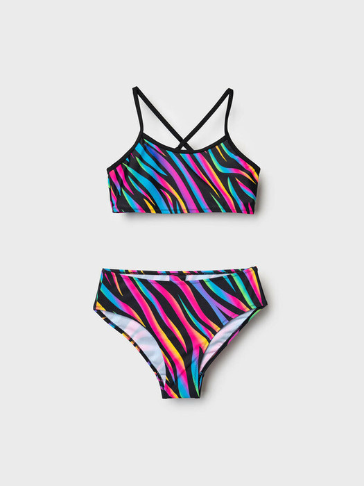 Раздельный купальник для девочки подростка. Состоит из укороченного топа и плавок классической формы. Верхняя часть на тонких регулируемых бретелях, которые перекрещиваются на спине для более надежной посадки. Внутри есть мягкая подкладка. Эластичные вставки обеспечивают комфорт и свободу движений. Купальник выполнен из яркой ткани с радужным зебра-принтом на черном фоне, что делает его особенно привлекательным. Все края аккуратно обработаны мягкой резинкой, чтобы не натирать кожу. Благодаря UF-защите, ткань сохраняет первоначальный вид даже при длительном пребывании на солнце. Идеален для активного отдыха у воды.