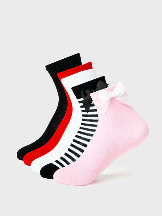 Набор детских носков для девочки. Комплект из 5 пар носков. В набор входят модели разных цветов: чёрные, белые, красные, розовые и полосатые. Две пары украшены объёмными бантиками — чёрный и белый — которые пришиты сбоку. Носки средней длины, с удобной эластичной резинкой сверху. Пятка и носок выполнены в контрастном цвете.