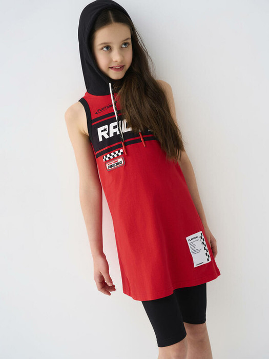 Платье в спортивном стиле для девочки подростка. Модель выполнена в прямом силуэте средней длины и дополнена капюшоном с регулировочным шнуром. Материал — мягкий и эластичный хлопковый трикотаж джерси. На груди — крупный контрастный принт, тематические гоночные надписи и элементы в виде флага. В нижней части — декоративная нашивка с графикой. Капюшон на подкладке с удобной посадкой.