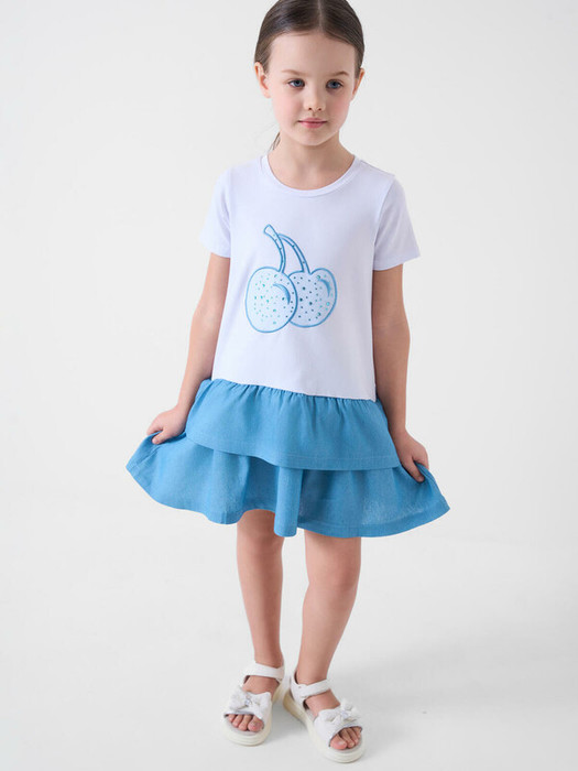 Лёгкое летнее детское платье для девочки. Выполнено из хлопкового трикотажа. Модель в стиле футболки с пышной двухъярусной юбкой. Верхняя часть — белая, с короткими рукавами и круглым вырезом. На груди — декоративная вышивка в виде вишен, выполненная с использованием сетки и пайеток. Юбка синяя, с джинсовым эффектом. Платье длиной чуть выше колена.