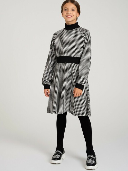 Платье из плотного жаккардового трикотажа. Манжеты, горловина и пояс по талии выполнены из эластичного риба.