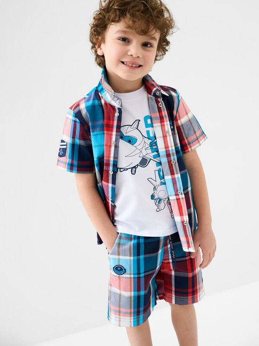 Детские шорты для мальчика. Модель прямого кроя из дышащего, хлопкового поплина. Удобная посадка обеспечивается эластичным поясом со шнуром. Спереди — боковые карманы и декоративные нашивки.