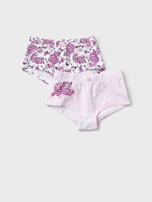 Набор из двух трусов-шорт для девочки подростка. Дизайн с любимым мультяшным героем - котом Чеширом. Изделия выполнены из мягкого эластичного трикотажа, с широкой резинкой по поясу и окантовкой по вырезам для ног. Внутри предусмотрена ластовица.