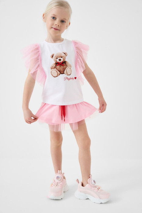 Детская юбка-шорты для девочки. Модель из мягкого хлопкового трикотажа джерси. Внешне выглядит как короткая юбка, но внутри вшиты удобные шорты, что делает модель комфортной для активного отдыха. Пояс широкий и эластичный, с декоративным шнурком. По низу юбки — легкая сетка, придающая изделию воздушность и дополнительный объём.