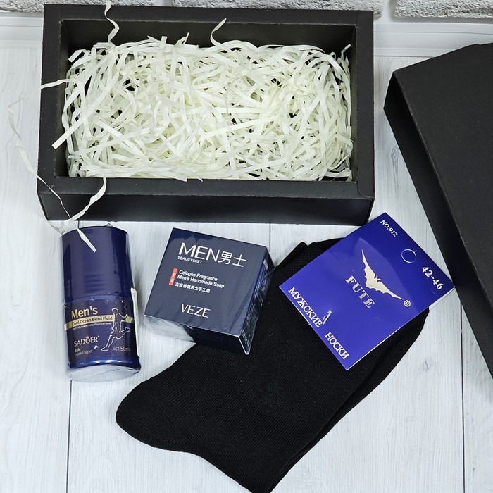 В набор входят:1. Мужское освежающее мыло Veze, 100 гр. 2. Мужской дезодорант-антиперспирант роликовый Sadoer, 50 мл. 3. Носки мужские черные, размер 42-46. Состав: 85 % Хлопок, 10 % Полиамид, 5 % Эластан. 4. Черная коробка как на фото размером 20*12*6 см.+ декоративная бумажная стружка.