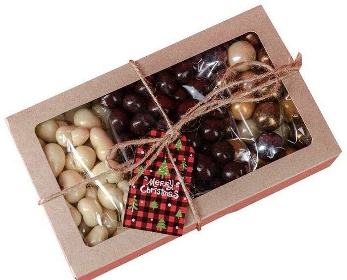 СОСТАВ: фундук в цветном бельгийском шоколаде, кешью в бельгийском шоколаде с ароматом кофе, фундук в белом бельгийском шоколаде.