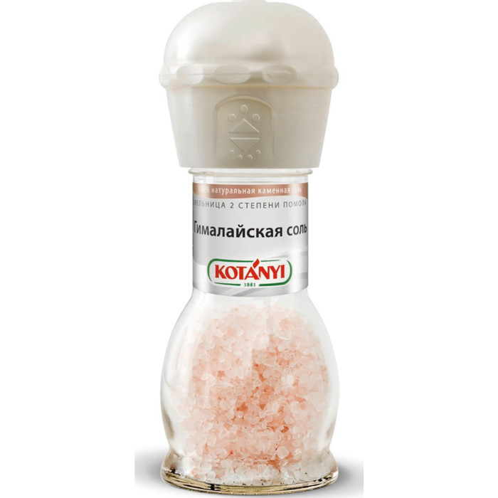 Полностью натуральная каменная соль высшего качества с нежным розовым оттенком поставляется из Пенджаба, Южные Гималаи. Соль Гималайская Kotnyi подчеркивает вкус мяса, рыбы, овощных блюд и соусов. С такой удобной мельницей вы сможете по достоинству оценить все преимущества соли. Пластиковый механизм на крышечке имеет две степени помола. Чтобы выбрать крупный, переверните мельницу и опустите механизм до щелчка. Чтобы использовать мелкий помол, поднимите механизм по стрелочкам. Подходит для сервировки стола.
