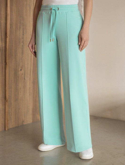 Состав: 95%Хлопок 5%ПУ Плотность: 240 Г/м2Брюки мятного цвета прямого кроя выполнены из премиального футера-двухнитки. Лаконичный силуэт поддерживают застроченные стрелки, зрительно вытягивающие силуэт. Удобный пояс на резинке регулируется хлопковым шнурком с золотистой фурнитурой. Наличие эластана в составе изделия гарантирует комфорт и долговечность изделия. Эластичный материал хорошо пропускает воздух, позволяя телу дышать, и легко тянется, не ограничивая движения.