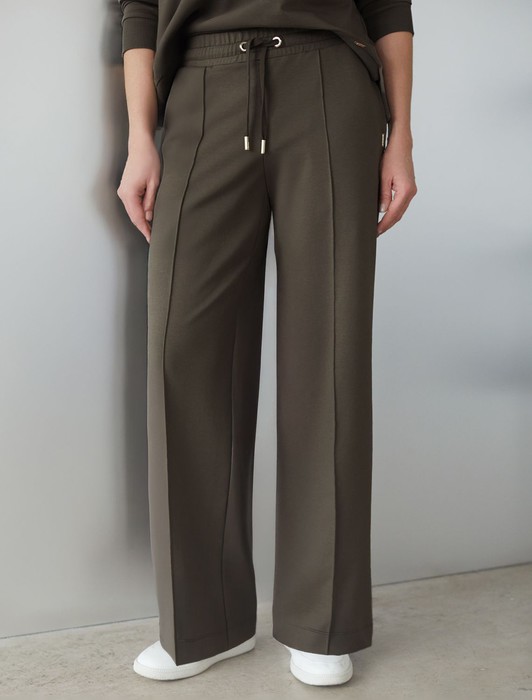 Состав: 75%Хлопок 20%ПЭ 5%ПУ Плотность: 240 Г/м2Брюки цвета хаки прямого кроя выполнены из премиального футера-двухнитки. Лаконичный силуэт поддерживают застроченные стрелки, зрительно вытягивающие силуэт. Удобный пояс на резинке регулируется хлопковым шнурком с золотистой фурнитурой. Наличие эластана в составе изделия гарантирует комфорт и долговечность изделия. Эластичный материал хорошо пропускает воздух, позволяя телу дышать, и легко тянется, не ограничивая движения.