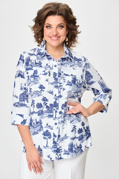 Блуза женская, прямого силуэта из текстильной ткани. Воротник отложной, застежка центральная на петли-пуговицы. По переду нагрудные вытачки и настрочены накладные карманы. Спинка цельная. Рукав втачной, одношовный, 3/4, с притачной манжетой. В боковых швах по низу небольшие разрезы. Длина по спинке 74 см, длина рукава 45.