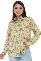 Изящная блуза свободного кроя. Полочка и спинка с отрезными кокетками, переходящими на верхнюю часть рукава. Кокетка полочки с разрезом и завязками у горловины. Горловина оформлена воротником-стойкой, верхний край украшен рюшей. По шву притачивания кокетка к полочке, спинке и рукавам выполнена сборка. Рукав длинный, одношовный, с поперечными рельефными декоративными швами. Нижний край рукавов оформлен манжетами с завязками.