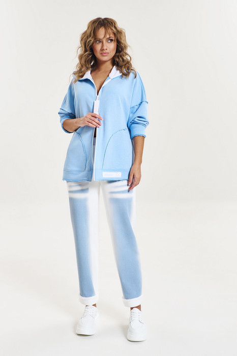 Джоггеры из футера 3-х нитки, качества пенье, с трикотажным поясом на резинке и четырьмя функциональными карманами. Передние половинки декорированы авторским принтом, имитирующим потертые джинсы. Некоторые швы изделия выполнены с сырыми срезами.