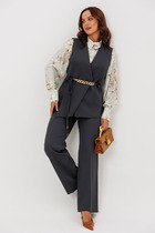 Костюм 2-предметный. Состоит из джемпера и брюк. Джемпер выполнен из трикотажного полотна, , горловина и низ изделия обработана притачной тикотажной деталью с необработанным срезом, с эффеком вытрепанности. линия плечевого шва спущена, рукав имеет клешеную форму, вставу из основной ткани, шнуруется на эластичный шнур. Брюки обработаны резинкой по поясу, вбоковых швах обработаны карманы. по центру передних половинок брючины обабтаны стачными необработанными швами.