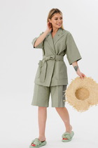 Костюм женский 2х предметный состоит из жакета и шорт. Жакет укороченный свободного кроя двухбортный. Горловина жакета V-образная с отложным воротником лацканами. По полочке жакета расположены накладные кокетки. Рукав втачной длинный, по низу рукава декоративная пата. Шорты завышенной посадки на притачном поясе. По передней брючине контрастная пола с накладным карманом. В боковых швах расположены функциональные карманы.