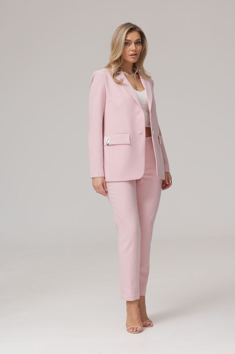 Костюм женский, состоящий из жакета и брюк. Жакет женский прямого силуэта с центральной бортовой застежкой на петли и пуговицы, частично на подкладке. По переду обработаны нагрудные вытачки, рельефы и прорезные карманы с клапаном и листочкой. Левый клапан декорирован нашивкой. Спинка со средним швом, в котором обработана шлица. Рукав длинный 2-х шовный, с имитацией шлицы, декорированной пуговицами. Воротник пиджачного типа с отрезной стойкой. Брюки женские, слегка заужены. Спереди карман с наклонным, застежка на молнию. Сзади застрочены вытачки, справа прорезной нефункциональный карман в рамку. Верх брюк обработан притачным поясом со шлевками, застегивающимся на петлю и пуговицу.