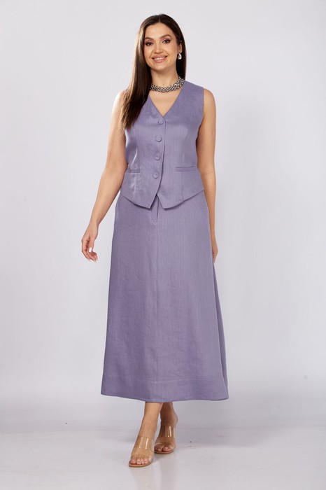 Комплект женский, состоящий из жилета и юбки. Жилетка со средним швом по спинке, переходящим в разрез. Завязывается сзади на пояс. По переду вытачки, переходящие в рельеф. V-образная горловина, фигурный низ, карманы с листочкой, функциональные, застежка на 4 пуговицы. Юбка А-силуэта со средним швом по спинке и переду. В боковых обработаны карманы, пояс на резинке, застежка на молнию и пуговицы.