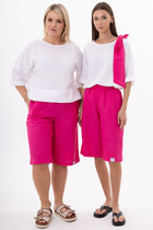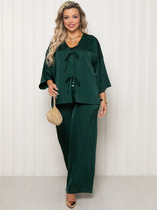 Костюм двухпредметный: состоит из рубашки и юбки. Рубашка прямого кроя со спущенной линией плеча. Горловина обработана рубашечным воротником с отрезной стойкой. Застёжка центральная на кнопки. Есть нагрудные карманы и в боковых швах. Низ рукава обработан притачной манжетой, застёгивается на кнопки. Фигурный низ. Изделие без подкладки. Элегантная юбка прямого силуэта длиной миди с разрезами на переднем и заднем полотнищах. Переднее полотнище с частичным запахом, имитацией боковых карманов с отрезным бочком. Заднее полотнище со средним швом, отрезной кокеткой, накладными карманами. Пояс притачной.