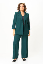 Жакет женский с центральной бортовой застёжкой до верха на 5 петель и пуговиц (размер и цвет фурнитуры может незначительно отличаться от фото) и отделочной тесьмой с цепью, идущей по горловине, вдоль борта, карманам, низу переда и рукава. Перед жакета с рельефными швами, выходящими из проймы до низа и накладными карманами с тесьмой. Спинка с рельефными швами и средним швом. Рукава втачные, двухшовные, длинные. По локтевому шву обработана шлица с двумя пуговицами и отделочной тесьмой. Горловина круглой формы, обтачная. Плечевой пояс оформлен плечевыми накладками.