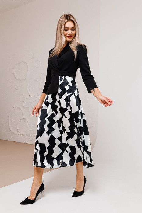 Платье женское прилегающего силуэта, расклешенное к низу. По переду платья нагрудные складки, воротник пиджачного типа, застежка с имитацией запаха. С переди по талии отдельная фигурная баска с клапаном. Спинка со средним швом и талиевыми вытачками. Рукав одношовный 7/8. Юбка притачная по талии полусолнце. В боковом шве платья застежка на потайную тесьму-молнию.