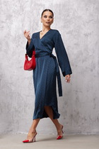 Платье А-силуэта. С втачным рукавом со сборкой по окату и внизу, на манжете с застежкой на петлю-пуговицу. По переду планка с застежкой на петли-пуговицы. Полочка и спинка с притачными воланами по низу. Платье на подкладке. Воротник стойка с рюшей.