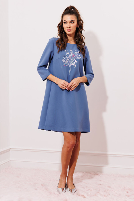 Платье А-силуэта с вышивкой Цветы с пришивными стразами в оправе по переду. Горловина округлая на обтачке. Рукав втачной одношовный с локтевой вытачкой. Спинка с вставкой из шифона в тон платья с декоративной металлической тесьмой-молнией сверху.