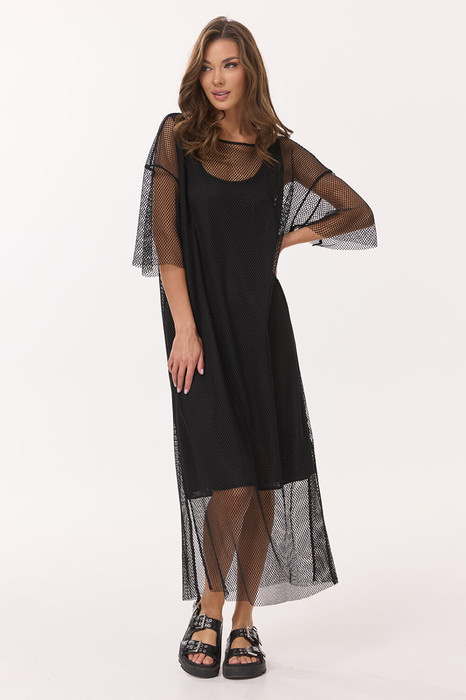 Платье двойное. Верхнее из сетчатого трикотажного полотна прямого силуэта, длинное, с коротким втачным одношовным рукавом.  По спинке настрочена нашивка с печатью "BUTER" Горловина лодочка. По боковым швам обработаны разрезы. Нижнее платье из трикотажного полотна прямого силуэта без рукавов.