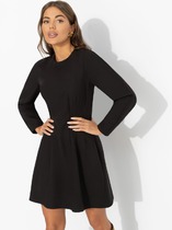 Платье женское на подкладке, полуприлегающего силуэта, длиной ниже колена. На переде карманы «в рамку» с клапаном. В верхней части спинки фиктивная застежка на 7 непрорезных петель и пуговиц, в нижней части спинки шлица. Застежка потайная молния в левом боковом шве.