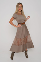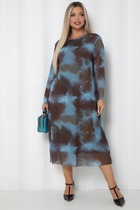 Платье женское повседневное полуприлегающего силуэта расширеное к низу вполнено из трикотажного полотна двух дизайнов. Вырез горловины мягкая обтачка из отделочной ткани, по спинке застежка на одну пуговицу и навесную петлю. Рукав реглан по низу на широкой притачной манжете из отделочной ткани. В боковых швах обработаны карманы, по центральной части полочки небольшие разрезы Декором платья служит анималистический принт.