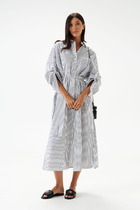 Платье с центральной застежкой на петли и пуговицы, втачным воротником с отрезной стойкой. По переду- накладные карманы с клапанами расположенные на уровне груди. Накладные карманы с цельнокроенной патой расположены на уровне бедер. Спинка со средним швом. Пата рукава переходящая в погон по плечевым швам. Платье со съемным поясом.