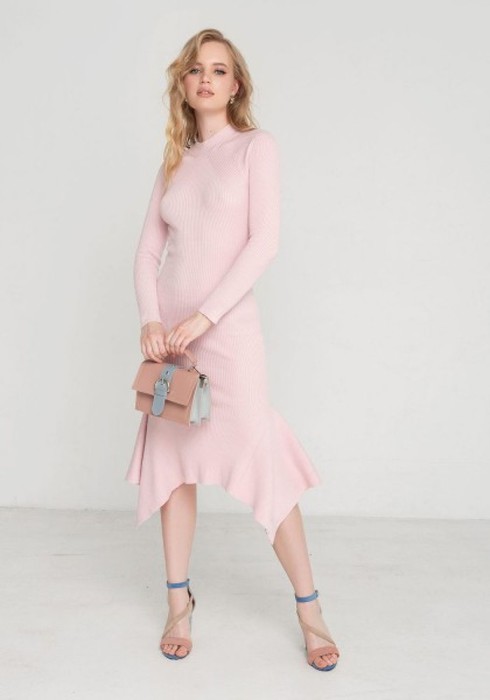 Платье прилегающего силуэта длиной ниже колена с сильным клешением книзу по форме квадрата. Рукав покроя реглан стандартное длины. Вырез горловины круглый с воротником стойкой. На спинке расположен декоративный вырез в форме капли.
