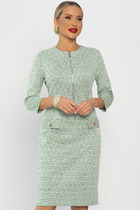 Платье из мягкой вискозной ткани (плательный креп турецкого производства) полуприлегающего силуэта. По переду обработаны нагрудные вытачки и планка до линии груди, застёгивающаяся на 4 декоративные металлические кнопки. Воротник рубашечный с отрезной стойкой. Рукав цельнокроеный, короткий, спущенный с отложной манжетой по низу.