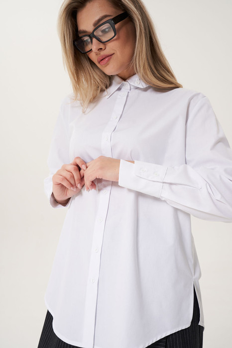 Это исключительное сочетание стиля и комфорта. Асимметричная манжета добавляет вашему образу экстравагантность и утонченность одновременно. Пуговица на воротнике подчеркивают внимание к деталям, придавая рубашке изысканный вид. Спущенная кокетка придает легкость и современный акцент. Модель оверсайз создает свободный, стильный силуэт, позволяя вам чувствовать себя комфортно и выглядеть по-настоящему модно. Универсальная длина делает ее идеальным выбором для различных ситуаций. Модель представлена в трех цветах: белый, голубой и черный.