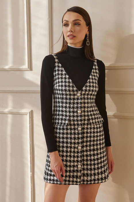 Сарафан из мягкой  костюмной   ткани с дизайном педипюль, на тонких бретелях, полуприлегающего  силуэта, длиной выше линии колена.  Горловина углубленная  V-образной формы.  Перед с нагрудными вытачкам из боковых швов и талиевыми вытачками, от линии груди до линии бёдер, с функциональными карманами,  с клапаном и обтачкой, на уровне бёдер. Спинка  с талиевыми вытачками и средним швом, вырез горловины спинки прямой, выше линии лопаток. Застёжка центральная, однобортная на пять петель и пуговиц. Сарафан на подкладке.