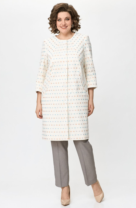 Женский удлиненный жакет-кардиган, на подкладке, прямого силуэта. Горловина округлой формы, от горловины идут рельефы, закругленные к боковому шву, в которых обработаны карманы. Спинка цельная. Рукав втачной, двухшовный, 3/4. Длина рукава 49 см, длина по спинке 89 см.