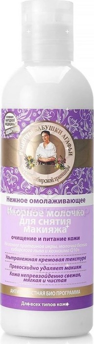 Это омолаживающее молочко с бархатистой текстурой создано по рецептам сибирской травницы Агафьи и на основе протеинов черной икры, молочка белого сибирского льна и других активных компонентов, что наделяет его способностью бережно очищать от разных загрязнений, снимать косметику и качественно ухаживать за кожей, не нарушая природный баланс.