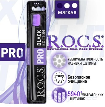 Мягкая зубная щетка R.O.C.S. PRO 5940 разработана с участием ученых и практикующих стоматологов.Она обладает уникальными характеристиками.Щетка деликатно очищает зубы и десны, не травмируя ткани ротовой полости, а необычная эргономичная форма ручки обеспечивает комфорт ежедневного использования.Щетка зубная ROCS PRO мягкая 5940 оснащена ультратонкими щетинками особой формы Trilabal, количество которых, по сравнению с классической моделью щетки РОКС, увеличено в 2 раза. Новое изделие имеет 5940 щетинок. При их изготовлении применена уникальная технология качественной тройной полировки кончиков, что гарантирует безопасность использования: обеспечивается качественная чистка, исключается риск повреждения десен и твердых тканей зуба.Особая форма щетины зубных щеток R.O.C.S. PRO 5940 с уникальным треугольным сечением, образует три чистящих ребра. Такая особенность повышает эффективность использования изделий, давая возможность не только чистить зубы, но и делать деликатный массаж десен.Благодаря особенностям ручки и щетинок, щетка для зубов РОКС ПРО 5940 мягкая: