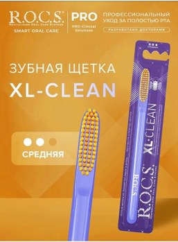 ЗУБНАЯ ЩЕТКА С УВЕЛИЧЕННОЙ ГОЛОВКОЙ ДЛЯ ЭФФЕКТИВНОГО ЕЖЕДНЕВНОГО УХОДА ЗА ЗУБАМИ И ДЕСНАМИ Зубная щетка R.O.C.S.® XL-CLEAN изготовлена с использованием текстурированной щетины с закругленными безопасными кончиками. Обеспечивают быстрое и качественное очищение, не повреждают эмаль, реставрации из пломбировочных материалов. Высокое качество очистки и легкий доступ к труднодоступным участкам полости рта, межзубным промежуткам, небной и язычной поверхностям зубов.