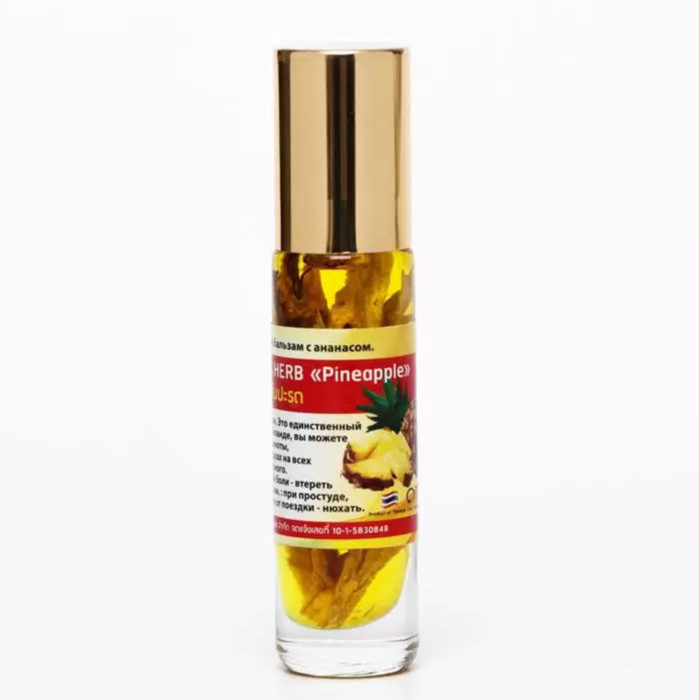 Banna Oil Balm With Herb Pineapple – это тайский жидкий бальзам с эфирными маслами и ананасом, популярное натуральное средство от укачивания, головной боли и насморка, очень приятно пахнущий и дополнительно настоянный на свежем ананасе.В составе ингалятора с ананасом 3 вида эфирных масел - камфорное, эвкалиптовое и ментоловое плюс тонко нарезанные свежие кусочки ананаса.• Камфорное масло оказывает тонизирующие действие и улучшает вентиляцию легочных альвеол, облегчая дыхание• Масло эвкалипта обладает антисептическим и противовоспалительным свойствами• Ментоловое масло поможет избавиться от головной боли• Ананас содержит множество витаминов и полезных веществ. Масло ананаса увлажняет и питает кожу. Поможет расслабиться после трудного дня, успокоиться и снять стресс.Стеклянный карандаш с шариком на конце. Имеет приятный ананасовый аромат.Применяют тайский ингалятор с ананасом при начинающемся насморке и простуде, при синдроме морской болезни, простуде, пневмонии, тайский ингалятор полезно вдыхать при гриппе, бронхите, синусите и астме.Тайский ингалятор с ананасом поможет не только при заболеваниях дыхательных путей, но и при бессоннице, вялости и расстройствах нервной системы.Способ применения тайского ингалятора с ананасом:• Головная боль – втирать в виски.• Насморк – нанести на кожу под носом, смазать крылья носа.• Тошнота, головокружение – виски, переносица.• Повышенное давление – нанести на затылочную кость.• После применения не забывать закрывать крышку – эфирные масла очень быстро испаряются.