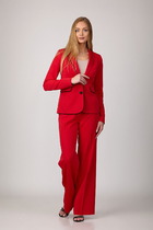 Костюм женский двух предметный: блузка и брюки, может использоваться как для повседневной носки, так и нарядная одежда. Блузка полуприлегающего силуэта. Перед с двумя нагрудными вытачками, цельнокроенный. Спинка с двумя талиевыми вытачками, с декоративной вставкой из отделочной ткани, вверху с разрекзом. Горловина круглая, обтачная, без воротника. Застежка на одну навесную петлю и одну пришивную пуговицу по разрезу спинки. Рукав, втачной, короткий, одношовный. Низ спинки, декоративная вставка спинки декорируется кружевом. Блузка с плечевыми накладками. Брюки женские длинные, слегка заужены к низу. Передние и задние половинки с двумя талиевыми вытачками. Застежка на тесьму-молнию . Верхний срез с притачным поясом, застегивающимся на одну обметанную петлю и одну пришивную пуговицу. Пояс собран на эластичную ленту от боковых швов к вытачкам задних половинок. Длина блузки 65.5 см. Длина рукава 24.5 см. Длина брюк 107см.