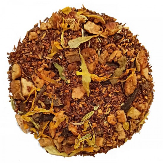 Большой популярностью у ценителей хорошего чая пользуются ройбуши с различными натуральными добавками. Напиток представляет собой смесь высококачественного ройбуша, кусочков яблока, корицы и гвоздики, аромат свежей выпечки. Этот чай отлично согреет в холодное время года.