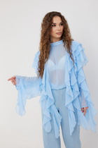 Тон задают безупречные детали: строгий отложной воротник на стойке, чёткая линия застёжки на пуговицах и идеальные втачные рукава, собранные у запястья в изящные манжеты. Их совершенство оттеняет смелая игра кроя - асимметричный низ, и та самая изысканная деталь в виде мягкого узла, которая придаёт силуэту запоминающийся художественный штрих.