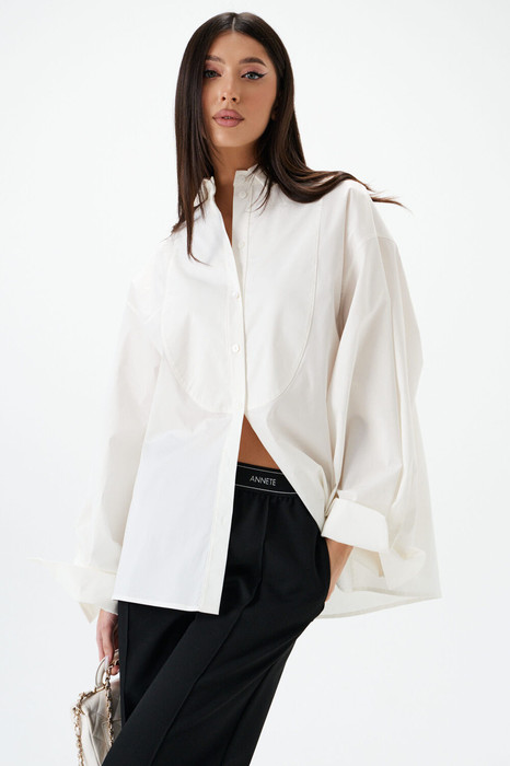 Рубашка прямого кроя. Выполнена из хлопковой ткани . По переду фигурная кокетка. Воротник рубашечного типа отложной на стойке. Рукав втачной, со спущенной линией плеча, с манжетой по низу. По спинке кокетка, Застежка центральная петли и пуговицы. Длина рукава 57 см. Длина спинки 70 см