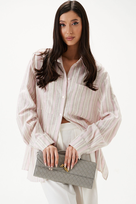 Рубашка свободного кроя. Выполнена из льняного (смесового) полотна. Прямой крой. Горловина круглая с отложным воротником на стойке. Рукав втачной, немного спущен, с манжетой с пуговичками. В боковых швах разрезы 28 см. Длина рукава 63 см. Длина спинки 72 см