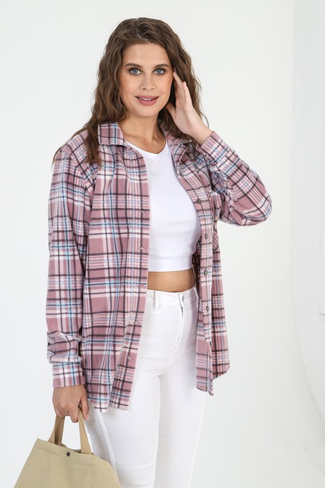 Рубашка (туника) женская из трикотажного полотна «флис» с рисунком в клетку, прямого силуэта, с длинными втачными рукавами на притачных манжетах, стояче-отложным воротником, нагрудным карманом, фигурным низом и центральной бортовой застежкой на петли и пуговицы. Спинка – с отрезной кокеткой и бантовой складкой в центре соединительного шва.