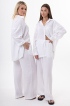 Рубашка из тонкого хлопкового джинса, свободного силуэта, удлиненной спинкой, застежкой на пуговицы спереди и рубашечным воротником. Спинка с отрезной кокеткой и бантовой складкой. Рукав короткий, цельнокроеный. На переде отрезные кокетки и накладные карманы с авторским принтом. Некоторые швы изделия необработаны, при энзимной стирке обретают стильную вытрепанность.